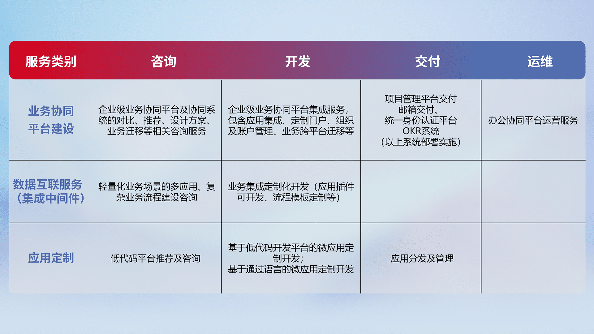 针对钉钉、、、、企微、、、、IDaas等平台级产品提供产品的规划、、、方案、、交付、、、、定制化开发等服务,,实现如统一协同办公、、智能客户服务、、、、混合会议管理、、、、智能数据查询、、、等业务场景,,实现数字化转型。。
